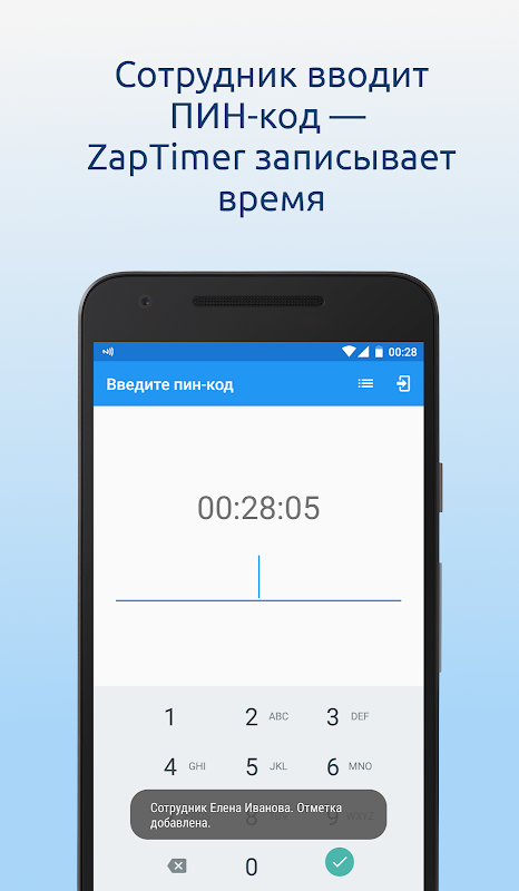 ✔ کارمند کلیدی خود قرار می دهد به تلفن. ZapTimer را ثبت تاریخ و زمان ورود و خروج کارکنان.