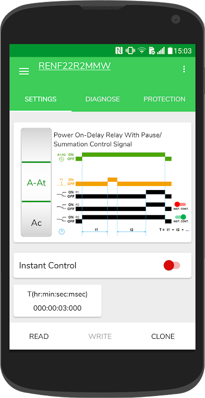 برنامه Zelio NFC می تواند برای تنظیم هر دو رله کنترل زمان سنج و سه فاز با استفاده از فناوری ارتباط نزدیک فیلد استفاده شود.