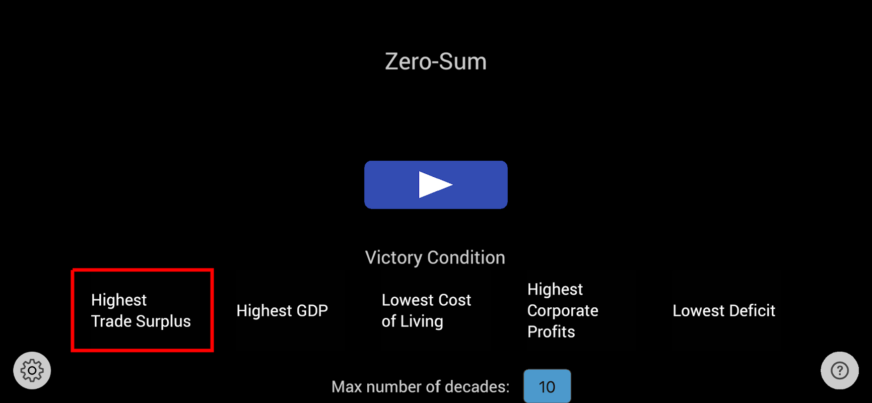 بازیکنان میتوانند انتخاب کنند که برای یک برد رقابتی (تراز تجاری مالی)، یا یک برد «انصاف اقتصادی» (آنهایی که در قدرت هستند مسئول فراهم کردن فرصت برای افراد کمتر خوش شانس هستند - بیکاری کم و شکاف ثروت کم)، یا یک برد «صنعت» انتخاب کنند. ، یا برنده "استاندارد زندگی" (هزینه پایین زندگی با هزینه مصرف کننده بالا). آیا امکان دستیابی به بیش از یک مورد وجود دارد؟