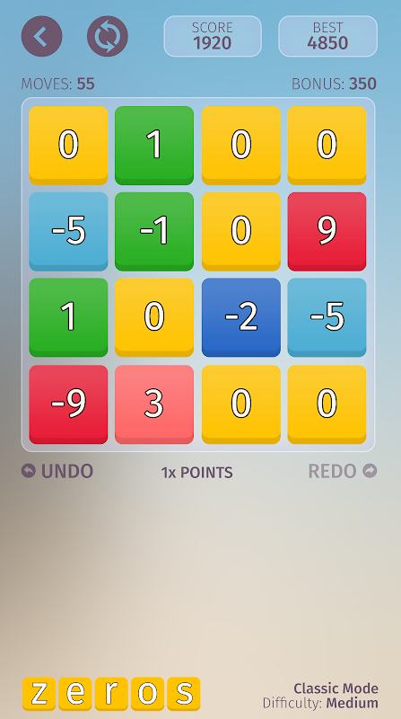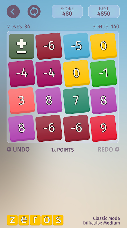 Zeros is a fun and challenging puzzle: Move blocks to perform addition. But be careful, blocks can't go over 9 or below -9. Connect 4 zeros to level up. Magic blocks will help you along the way.