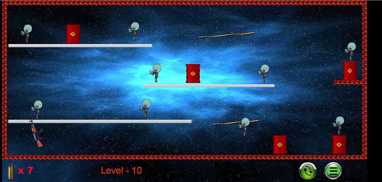 Touch the screen to set the target of the gun and fire the untouched bullet. And just kill all the zombies in the given total number of bullets. In this way, if you kill all the zombies within a certain bullet, then the stage is completed. You can go to the next stage.