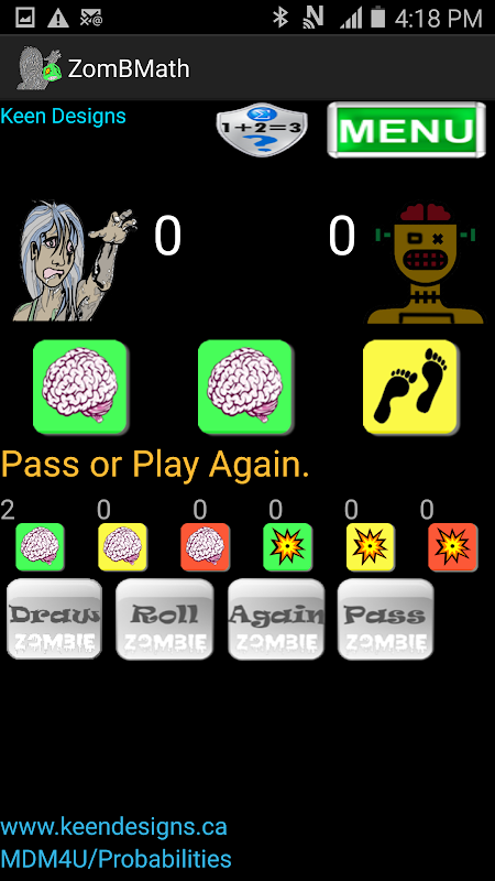 This is a full zombies math game version of dice probabilities. A player can choose to play against a robot zombie, or with another player. Players are racing to score 13 brains and playing in turn. Options for sound effects or changing racing score to win are provided. During a turn, a player draws and rolls 3 dice at a time, and keeps scores of brains and blasts. A player could keep on drawing and rolling dice and accumulate brains scores as long as the blast tally is less than 3, or the player will lose the brains tally and the turn. The player can also stop at any time during the turn to secure the scores. Player could also score bonus points or steal points from opponent by answering mathematical probability challenges (MDM4U level) correctly. Basic probability theories needed for the challenges are outlined in the info section.