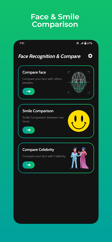 Unleash the power of facial recognition with Face Recognition & Compare! Compare faces, smiles, and even your favorite celebrities with lightning-fast results. Discover who's the winner in a smile-off or see how closely you resemble your favorite stars. Get ready to dive into the fascinating world of facial comparison!