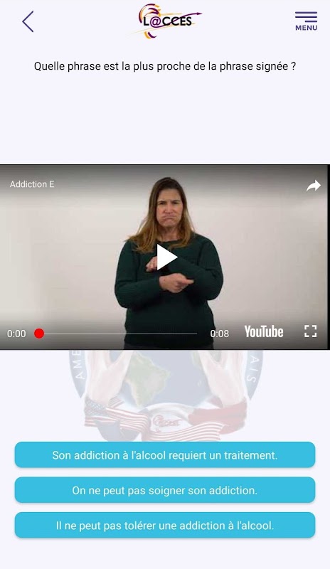The FACE to FACE English-ASL (American sign language)—French-LSF (French sign language) application is designed to help learners move between these four languages, improving their usage through immersion.. It is totally innovative by associating 2 languages with 2 sign languages. It has been elaborated by teams of hearing or deaf American and French professors, for whom those languages are their first language. The videos in LSF and ASL have been shot both in France and un the USA. Thus the authentic character of the languages is preserved.