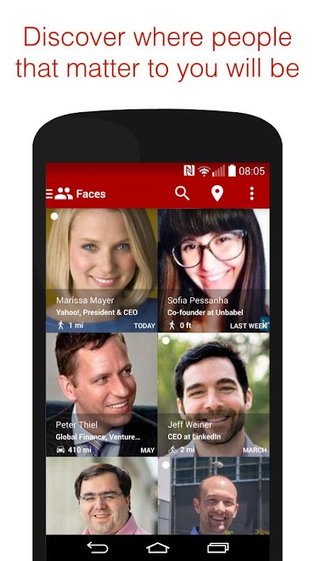 Combining LinkedIn with domain specific networks like AngelList and CrunchBase, FacesIn learns who interests you and discovers where he or she will be.