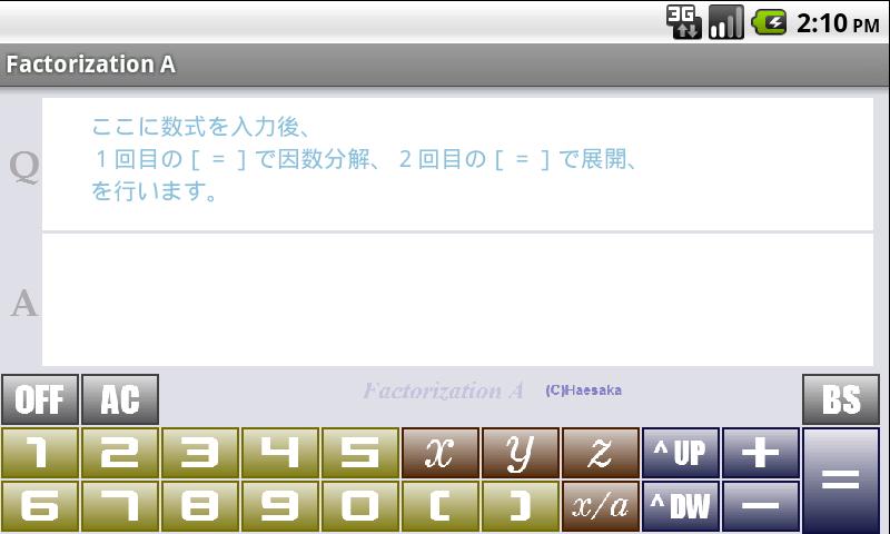 多変数多項式の因数分解<Factorization>/展開<Expansion>用の電卓アプリです。x, y, z(または a,b,c)3変数で各変数とも5乗までの数式が考慮されます。