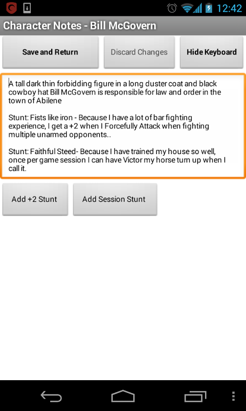 The text boxes have to be small to try to fit an entire character sheet into a phone screen size so a notes page is provided for each character sheet for recording extra detail about Description, High Concept, Stunts etc. This has buttons for adding stunt template text.