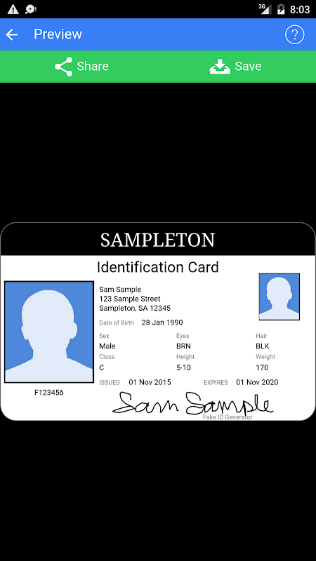 ID Card Generator takes you through a quick process where you enter information that you would like to appear on the ID card or license. You can even add your own photo, and draw your own signature. If you don't feel like including a certain bit of information, no problem, just leave it blank. In the end, you'll be shown your fully customized ID, which you can save, share with friends, or edit until it's perfect.