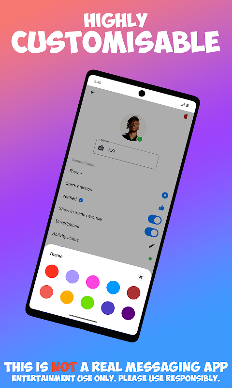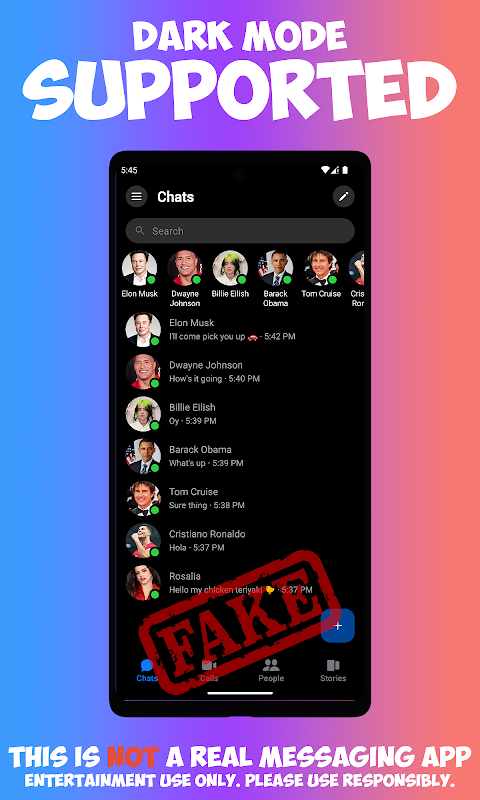 Please note that the Fake Chat App is intended for entertainment purposes only and should be used responsibly and respectfully. We do not endorse any misuse or harm caused by the app's content. This app is NOT associated with FB.