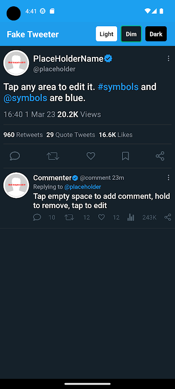 Up to date with current UI look of twitter (including views), everything is customizable so its up to you to get creative with how the tweets look. You have the ability to easily add comments and images to the tweet to get really specific with what kind of tweet you want to make.