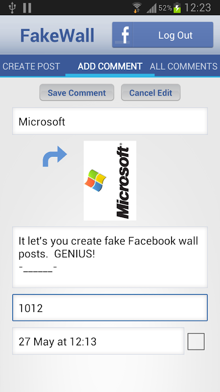 This is a fun application developed by a group of friends looking for ways to pull a gag on each other. This application will help its users to make fake Facebook wall posts along with comments and likes. You can choose friends from your Facebook friend list and add as many fake comments as you want.