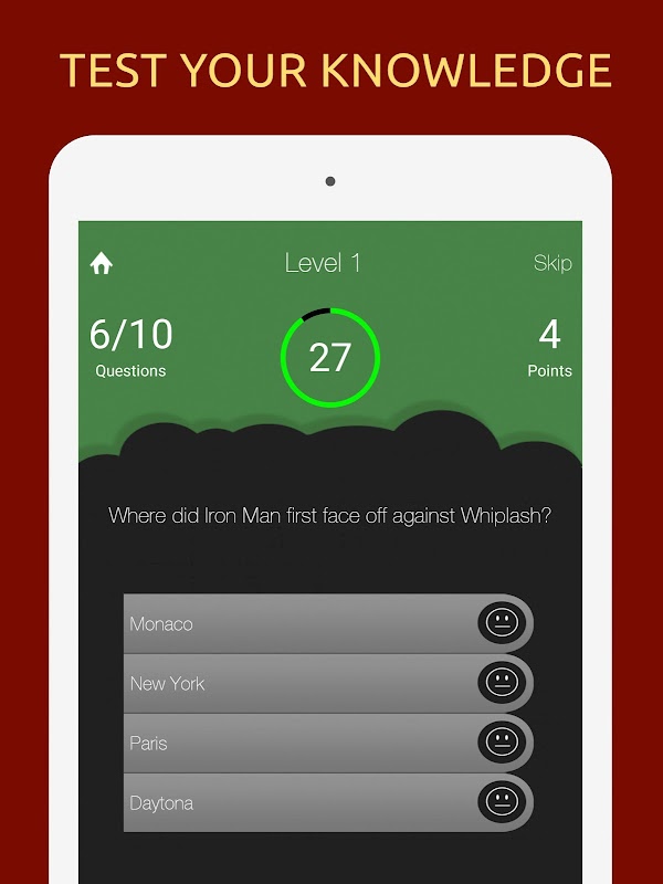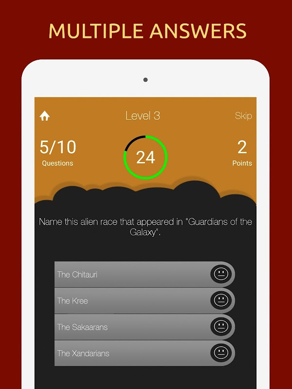 Trivia questions and answers are shuffled randomly every time you play. You can skip a question, if you don't know the answer. Play multiplayer one on one with your friends!