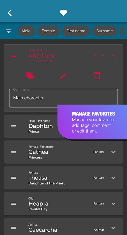 If you have found your perfect name, the fantasy name generator allows you to instantly save the name to your favorites list, where you can manage your favorites by adding tags and comments, for easy filtering. Edit your names, if the generated name does not perfectly fit your purpose or copy them to your clipboard to share them with friends.