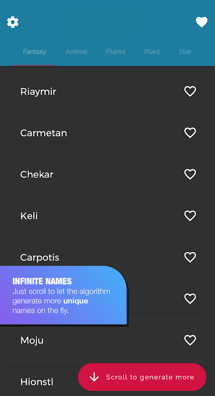 The fantasy name generator has basic knowledge of language and features several algorithms and rules to generate fantasy names that sound mystic and out of this world.
