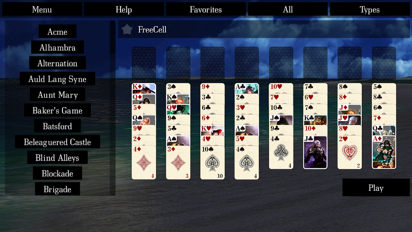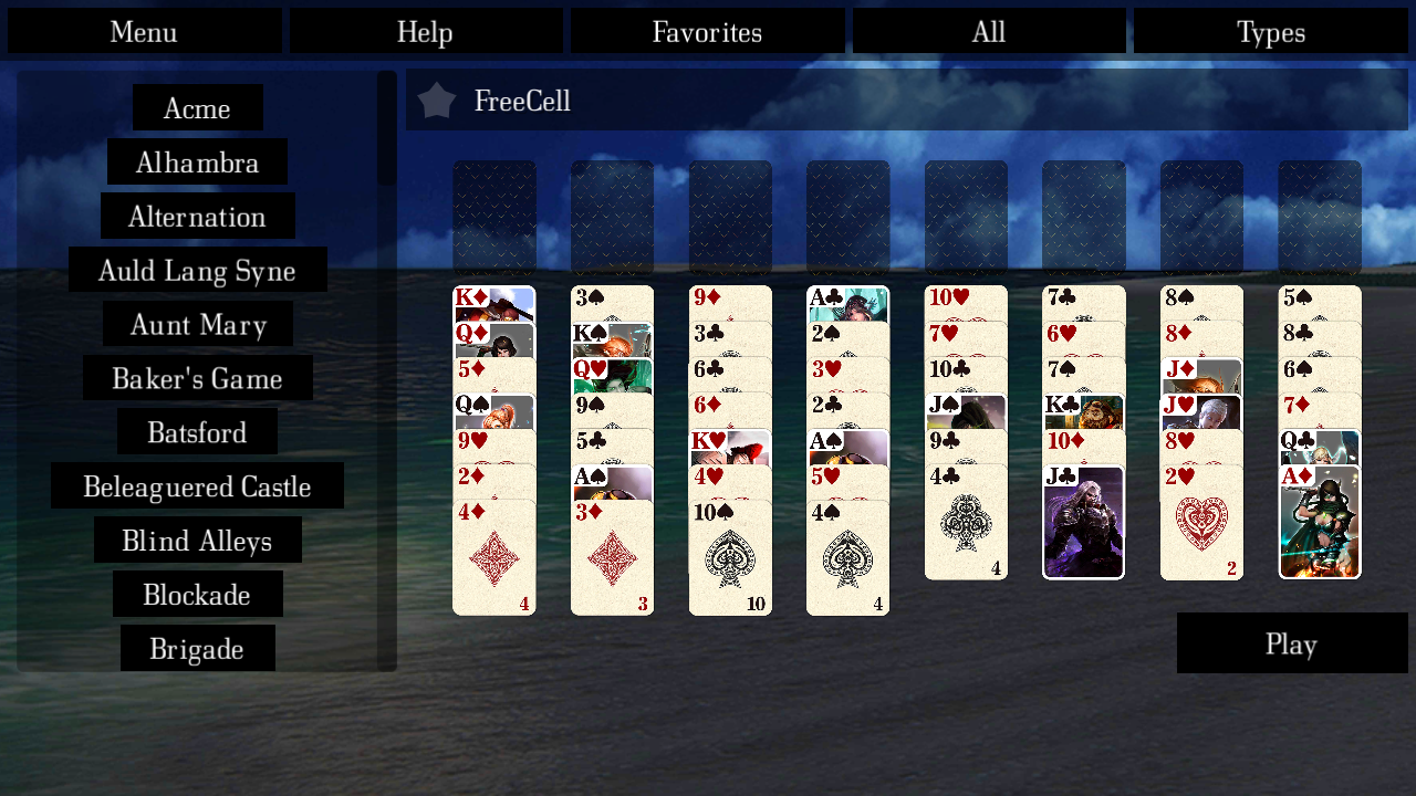 The game is a bundle of many different versions of solitaire / patience game. There are the commonly played solitaires like Klondike, Spider, FreeCell, Three Peaks, and Pyramid as well as many lesser known ones which you may be interested in learning in this game.
