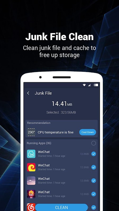Detect and clean apps that cause overheating. In one tap memory boost, cool down mobile in seconds.