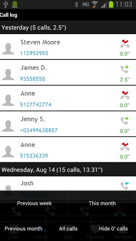* Detailed Call log with filters for missed, dialed, received calls as well as call period (last 7 days, previous week, this month)