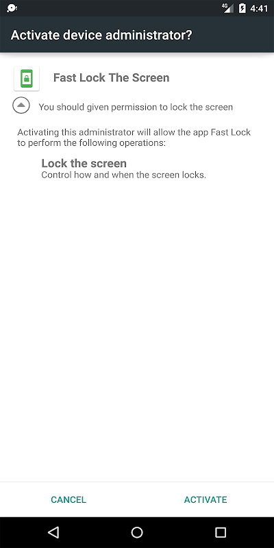 The app requests permission to "Lock the screen". If permission is granted, screen will be locked by one tap.