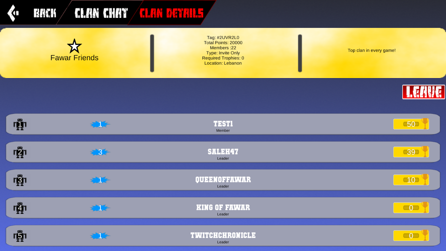 - Global Leaderboard based on trophies gained during multiplayer games