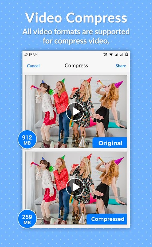 Video size reducer allows the user to compress your favorite videos and save the crucial space on your cell phone. Download this best video compressor to mp4 format and make your phone work efficiently.