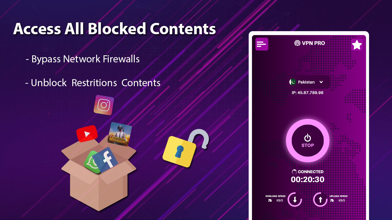 Pro VPN proxy that protects your online privacy security while accessing the Internet. It is the one-click VPN app if you want protected web surfing with a super unlimited proxy. The best VPN Pro. Enjoy fast and safe browsing from any part of the world using only this Pro VPN changes your IP address after the on, encrypts your internet traffic, turns public Wi-Fi into a private network, bypasses Internet censorship, overcomes geo-restrictions, grants access to the desired content, and unblocks apps, games, sites.