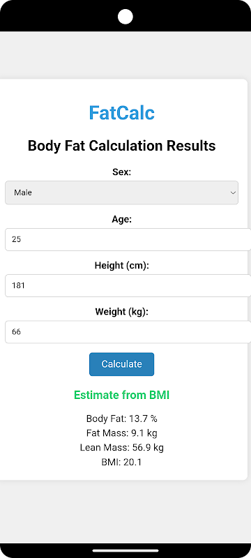 Discover your body fat percentage with ease using the "BMI-Based Fat Calculator" app. This intuitive tool leverages the Body Mass Index (BMI) method to provide a quick and accurate estimate of your body fat. Whether you're tracking your fitness progress or simply curious about your body composition, this app offers a straightforward solution for understanding your health metrics.