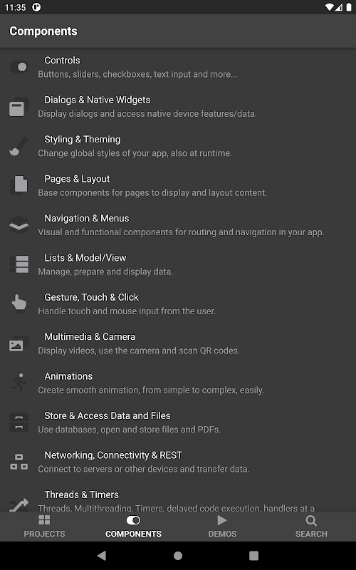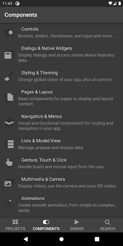 - Components that allow native user experience on all major mobile platforms with a single code base. E.g. on Android a navigation drawer is used, while on other platforms you will experience swipe back gesture support – this is supported automatically without any change of code.