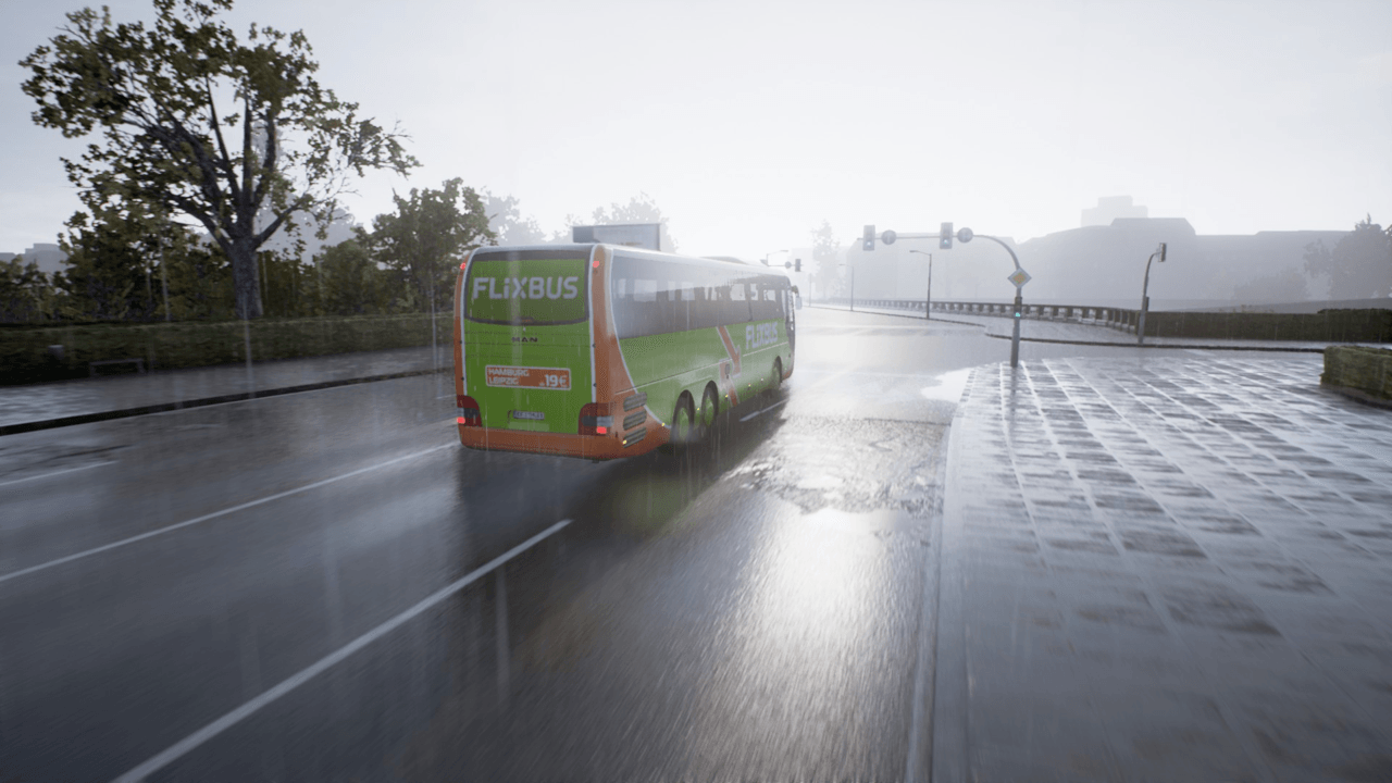 In the Fernbus Coach Simulator latest version, the licensed MAN cockpit details stand out. Controls, indicators, and announcements feel familiar once settled in, making long highway stretches engaging rather than routine. A sunrise departure showcases interior lighting and clear instrument feedback, while sudden rain or fog tests handling and attention.