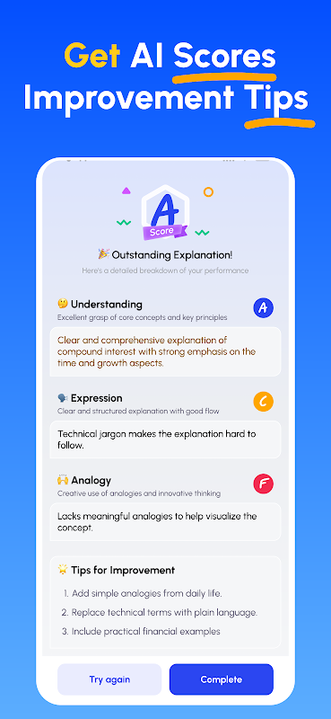 Receive scores and multi-dimensional feedback (e.g., Understanding Accuracy, Expression Clarity, Example Appropriateness) on your explanation.