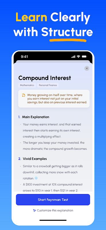Feynman AI isn't just another study app; it's your personal AI tutor and learning coach. It guides you through a proven process: first learn the essential details of a concept, then explain it in your own words as if teaching someone else. Our advanced AI provides instant, detailed feedback and analysis, helping you pinpoint weaknesses and refine your comprehension line by line. This active process naturally aids memorization.