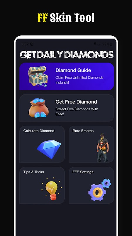 - FF Skin Tools is a fan-made application that aims to help you in getting free skins. We don't have a relationship with the developer of the game in any form. All property rights are owned by their respective holders. This app is not a cheat or hack to get free diamonds, skins, emotes, etc.