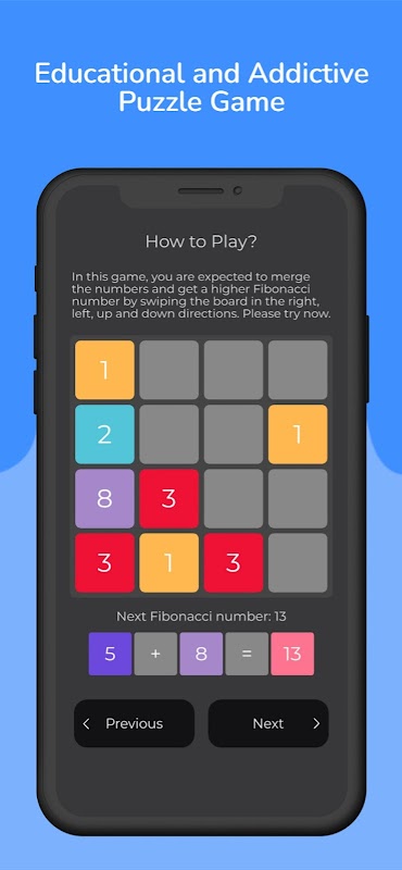 - In this game, you are expected to merge the numbers and get a higher Fibonacci number by swiping the board in the right, left, up and down directions.