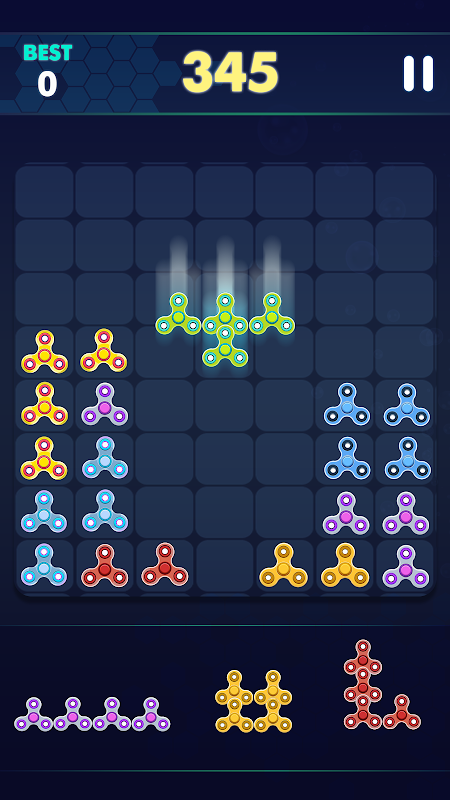 The goal is to drop fidget spinner blocks in order to create and destroy full lines on the screen both vertically and horizontally. Don't forget to keep the blocks from filling the screen.