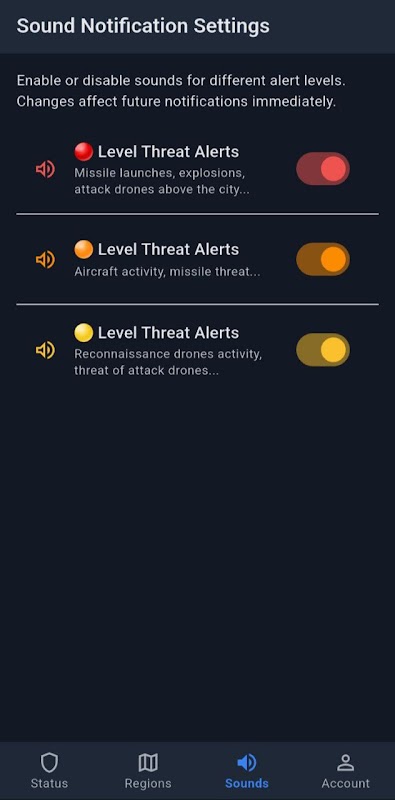 - On the main screen, each location has a clear color indicator (green, yellow, orange, red) and an icon corresponding to the current threat level.