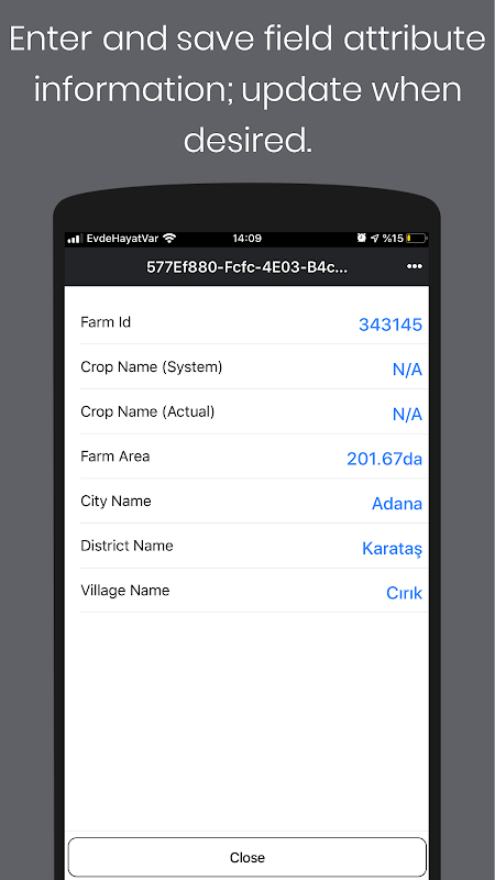 It is possible to use FieldWork Mobile App during field visits to improve its efficiency. Users may draw and save desired amounts of fields and may update when required. Fields are kept as both polygon and point. Attribute information (cultivated crop type and variety, dates of sowing and harvest) may be added into saved locations.
