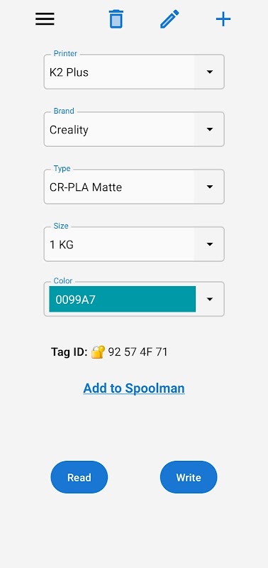 This app empowers you to create custom RFID tags for your 3D printing filaments, designed specifically for seamless integration with the Creality CFS, Anycubic Ace Pro, QIDI Box and Elegoo Canvas.