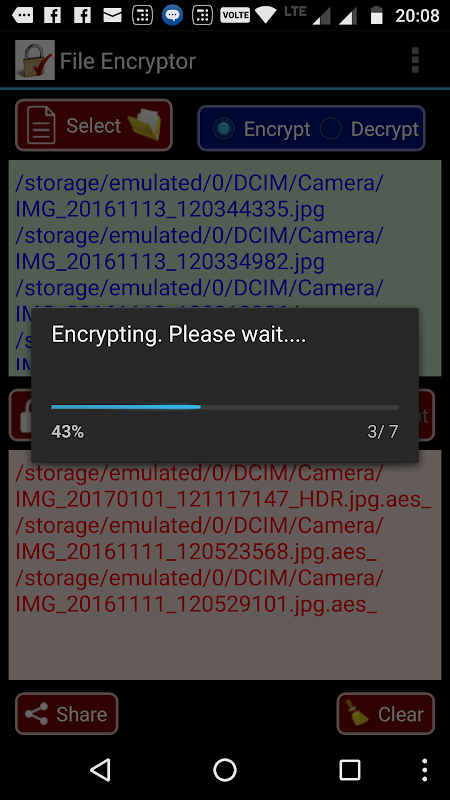This app can be used for encrypting your files using Advanced Encryption Standard (AES) with 256 bit key. It can encrypt/ decrypt files using AES. This app ONLY REQUIRES PERMISSION to WRITE SD CARD and NOTHING MORE, so you can be sure ,that your DATA IS SAFE. It is COMPLETELY FREE OF ADVERTISEMENTS. You can be sure that the app does what it promises . The crack resistitvity of an AES depends on the password length and complexity. The app warns if the user does not selects a password with min 6 characters having atleast one uppercase letter, one lower case, one special character and one digit.