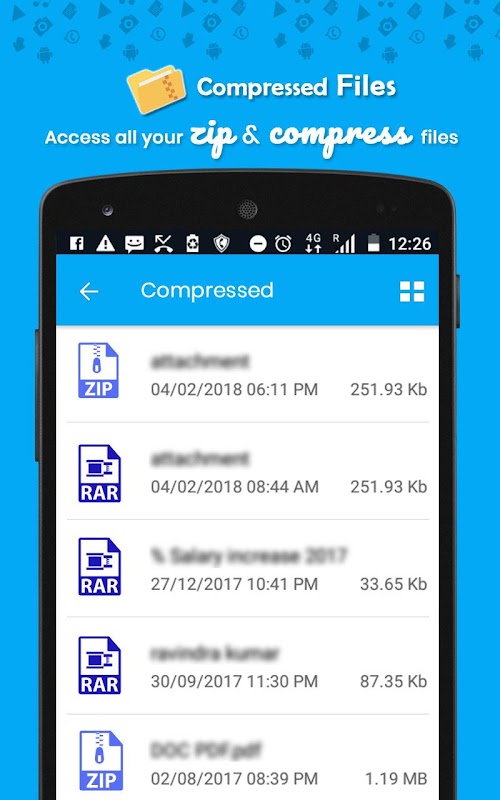 File Manager helps you handle all your all files whether they are stored on your device storage or SD card. View Images, Videos, Music, Apps, Doc, Compressed Files, Downloads, Internal & External Storage details on a single screen.