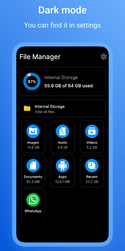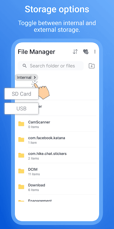 With our file manager, you can easily browse and manage your files and folders on your device, including your internal storage, SD card, and cloud storage accounts like Google Drive, Dropbox, and OneDrive. You can easily move, copy, delete, rename, or share your files, and even compress and decompress files with just a few taps.