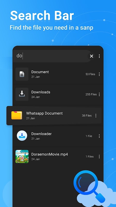 This is a file manager app with a simple user interface. With this app you can easily browse and manage the files on your mobile device. This app provides file transfer, accessing files and document management.