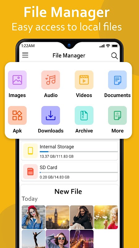File Manager find all photos, videos, and documents saved on your phone. File Search The optimized search engine of file explorer will find file in internal storage and SD card in 1 second. And users can browse files by category, e.g. image, music, video, apps, etc.