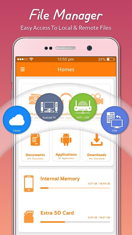 - Full-featured File Manager (Explorer) pro Android file manager and explorer provides full-featured file management, including cut, copy, paste, move, delete, rename, check detail, share files, etc. for internal memory and SD card. It works perfectly as file renamer and viewer as can open any file format.★ Super Fast File TransferWith build-in wifi file transfer, this free file manager and explorer exploits wifi & hotspot to transfer files to another phone and PC even without internet connection. Without limitation for file size and type, users can transfer any file including apps, video, music, picture, etc. super fast.★ Storage Analysis & Junk File CleanIntelligently, this pro file manager will analyze storage usage, detect large files, redundancy files, and newly-created files. Therefore users can make sense of storage usage, clean junk file and other files & folders that are no longer needed effortlessly.★ File SearchThe optimized search engine of file explorer will find file in internal storage and SD card in 1 second. And users can browse files by category, e.g. image, music, video, apps, etc.★ Private & SafeThis free file manager and explorer provides 100% local file management. Therefore there is no risk of any file leak. Your files and information are completely safe.