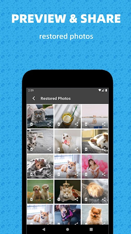 Recover deleted media files (photo, video, audio) from your device’s storage, and restore the photos right back to your phone. This is what it is all about. File Recovery app to restore deleted pictures,videos,audios a powerful and advanced file scanning engine is responsible to go through all your files including thumbnails and cached files, and restore lost files.