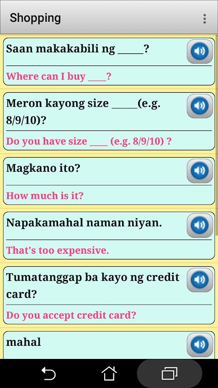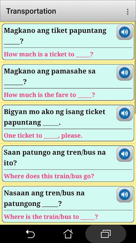 Collection of free Filipino phrasebook That help you to learn the Filipino language and communicate with Filipino people ,You can hear and learn them, You find more topics like : Filipino greetings , customs , transportation , directions , accommodation , communication , dinner , in the city , shopping , activities , colors and the questions.
