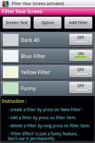 You can see result of filter by using 'Screen Test' which is included in this app, you can also use this feature to find dead pixels on your screen.