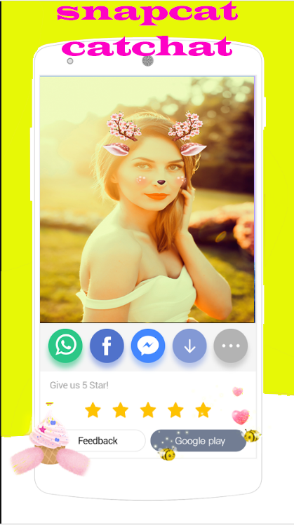 Create a snapcat catchat face camera face, cat face, rabbit face, rainbow, anime eyes, masquerade camera, emoji, tearss, snap text and more.