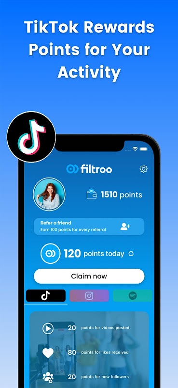 🎉 Ever imagined getting rewarded for your daily social media activities? With Filtroo, that dream becomes a reality! Filtroo is the ultimate app where your engagement on platforms like TikTok earns you points that you can exchange for amazing rewards. And it’s just the beginning - we’re gearing up to include Instagram and Spotify, expanding your opportunities to earn!