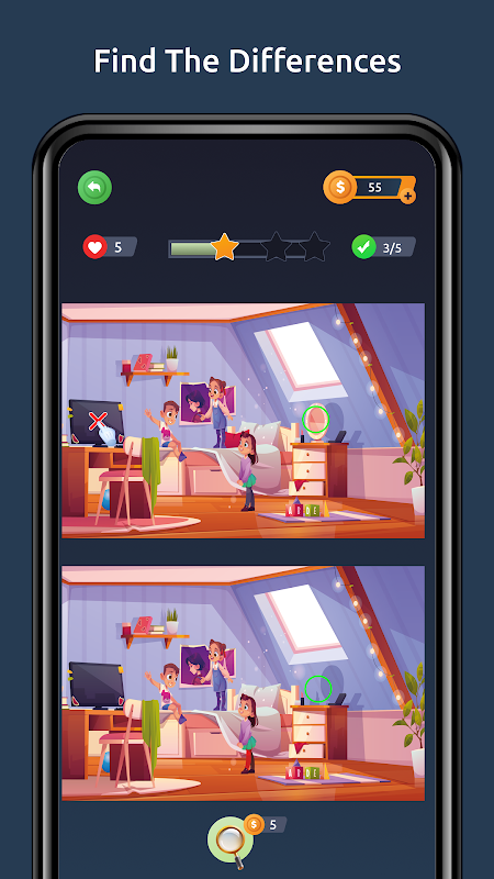 Spot 5 differences, 5 lives. Use the coin guide. Ready to elevate? Start now!