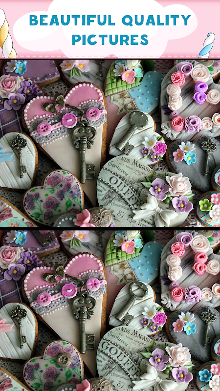 Zoom functionality will help you to spot even well hidden differences. No time limit - search at your own pace. Your goal is simple: look at the pictures, find the differences, then tap each one you locate.