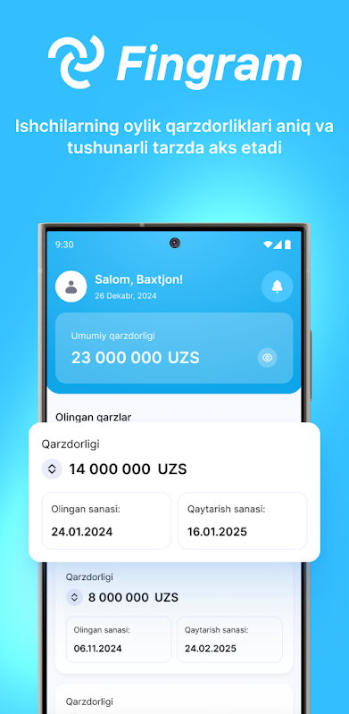 • Fingram ilovasi foydalanuvchilarga o'z moliyaviy holatini boshqarish, xarajatlarni kuzatish va daromadlarni rejalashtirishda yordam beradi. Foydalanuvchilar o'z kirim va chiqimlarini ilova orqali kuzatishlari mumkin.